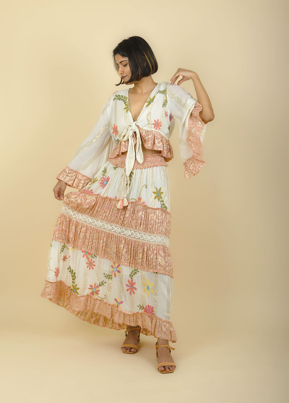 AviEvie's Boho Floral Embroidered Two-Piece Set for Women – Crop Top & Maxi Skir